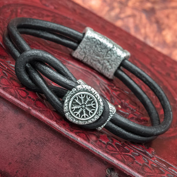 Dette er et mesterligt håndlavet læderkrogarmbånd i sort læder med Helm of Awe-symbolet præget ind i det modsat en knuder. Både symbolet og knudebeslaget er håndlavet efter den ældgamle tabte voksmetode fra Bronze, som derefter er belagt med fint italiensk sølv.