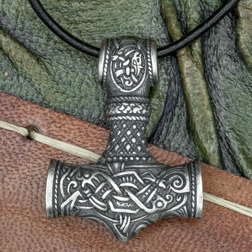 Este es un pesado colgante hecho de bronce macizo recubierto de fina plata italiana, con un diseño único realizado utilizando el arte perdido del moldeado en cera que ha sido completamente esculpido a mano. Inspirándose en la obra de arte Mammen Axe y el estilo artístico vikingo Jelling, este es un colgante moderno y muy detallado del Martillo de Thor con motivo de estilo Jelling. Se suministra con un cordón negro. El acorde puede variar de la imagen de vez en cuando dependiendo del stock disponible.