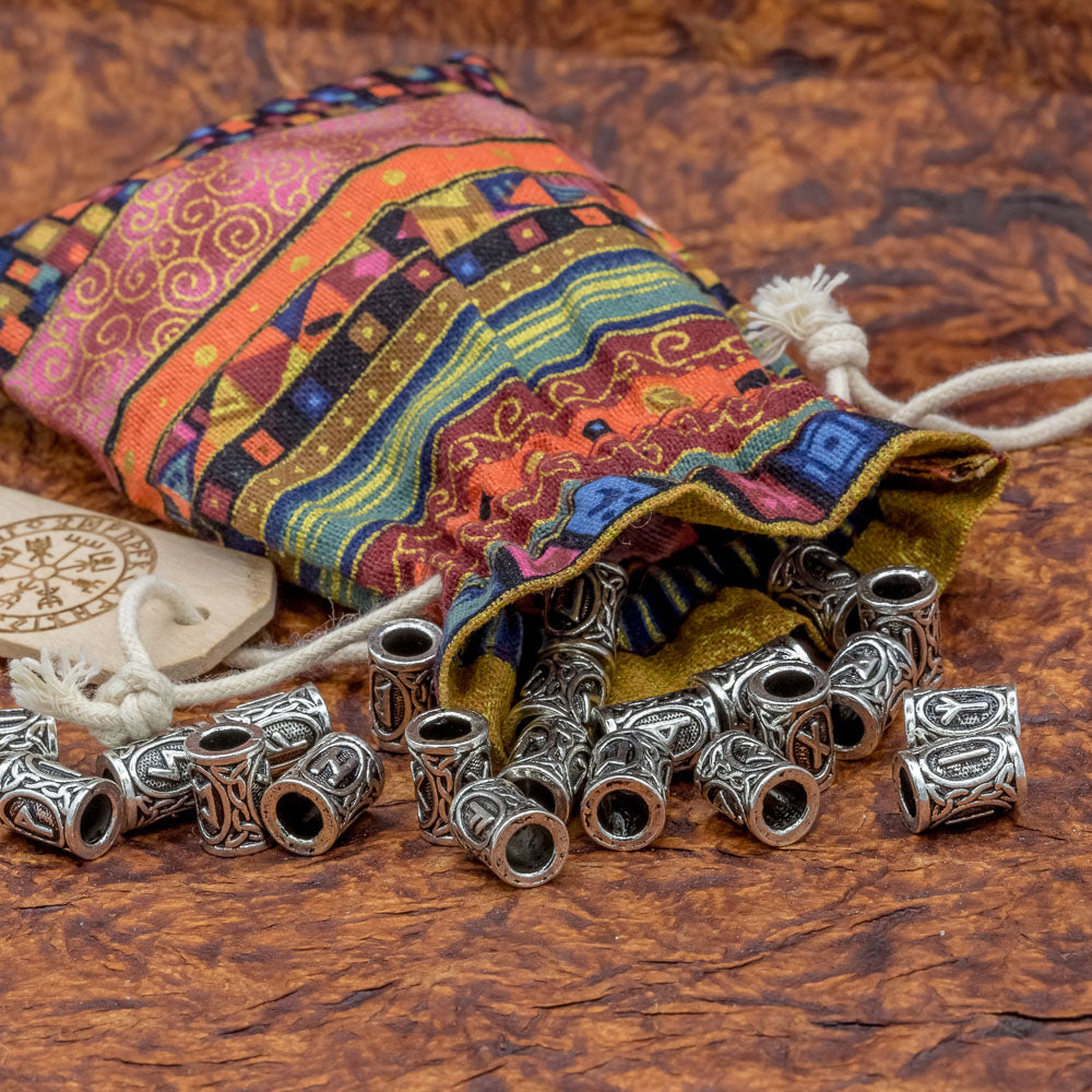 This is a full set of the 24 Elder Futhark Rune Hair and Beard Beads made from stainless steel therefore suitable for constant wear. The set comes in a decorative black pouch (please note the pouch pictured with the wooden tags was a prop for the original image. A lovely pouch to keep the beads in will be supplied vut not the one pictured).