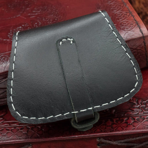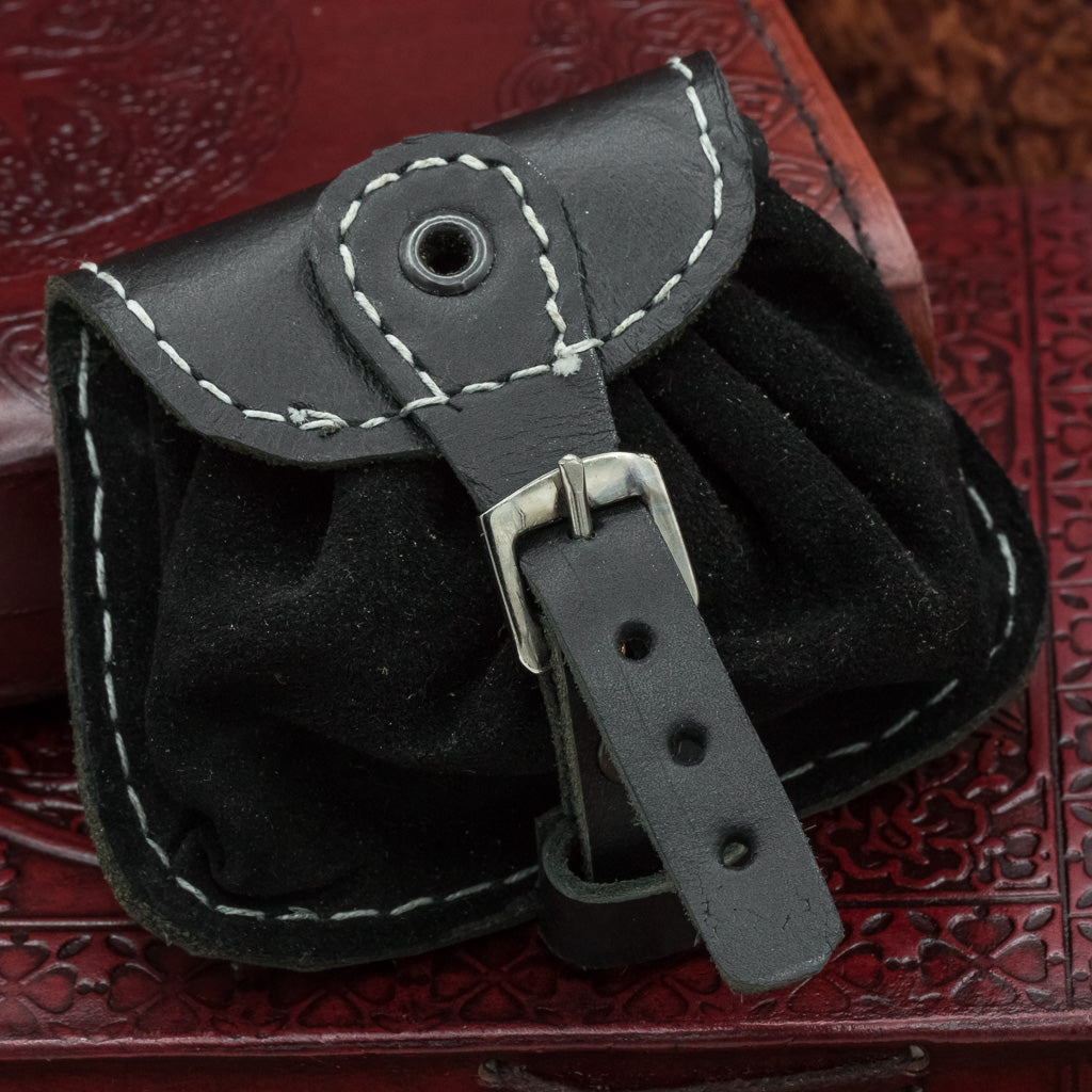 A small belt pouch made of high-quality black cow hide and suede sown by hand with white stitching. It has a loop to attach onto your belt.