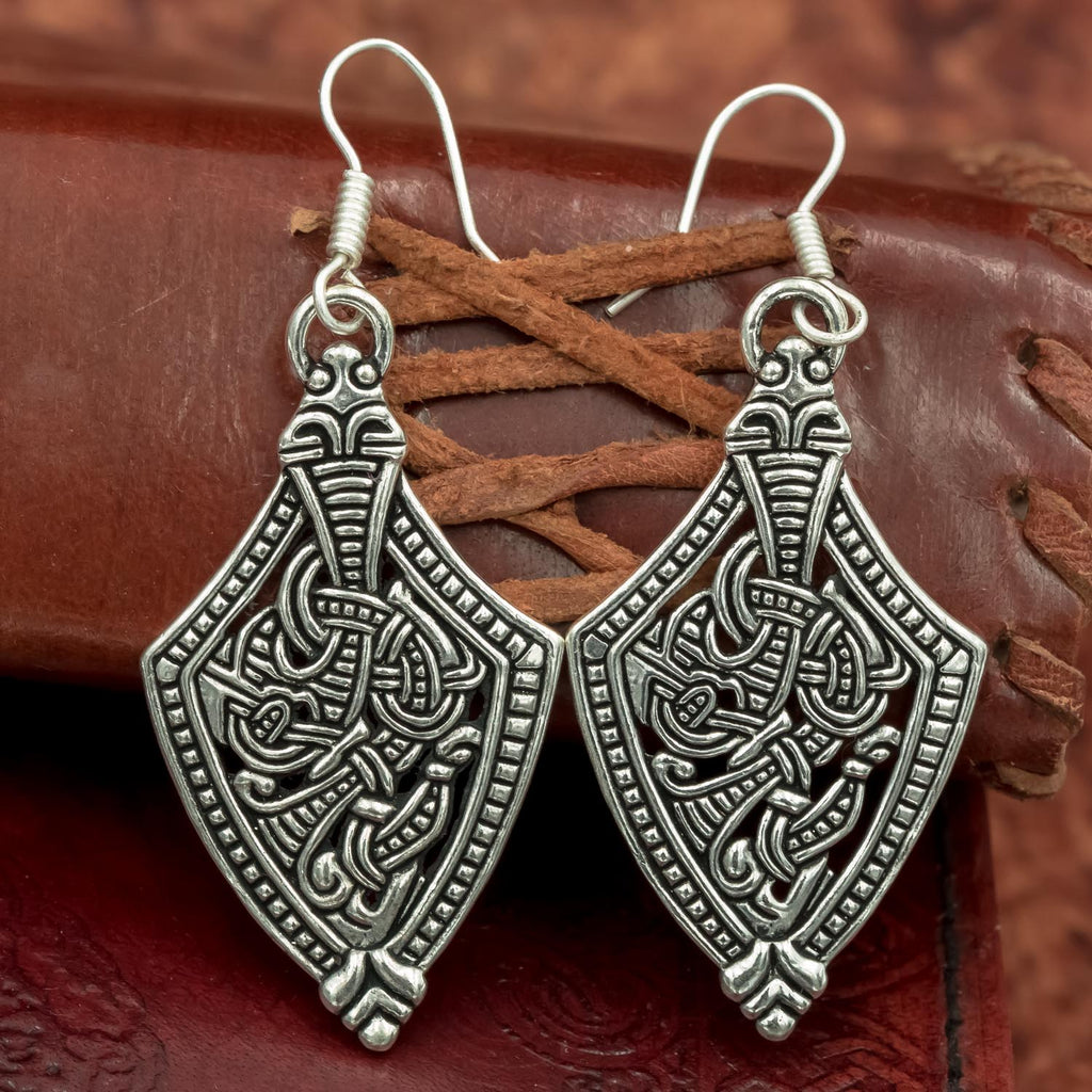 This is a pair of Viking earrings modeled on the chape of a 9th - 10th century Viking sword in the Borre style. They're made from silver plated bronze.