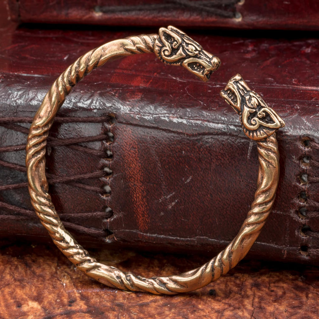 This sturdy bronze bracelet modelled by finds from the Viking Age can be individually adjusted to size and is suitable for chunky arms.The ends of this early medieval piece of jewellery are shaped to represent Fenrir.