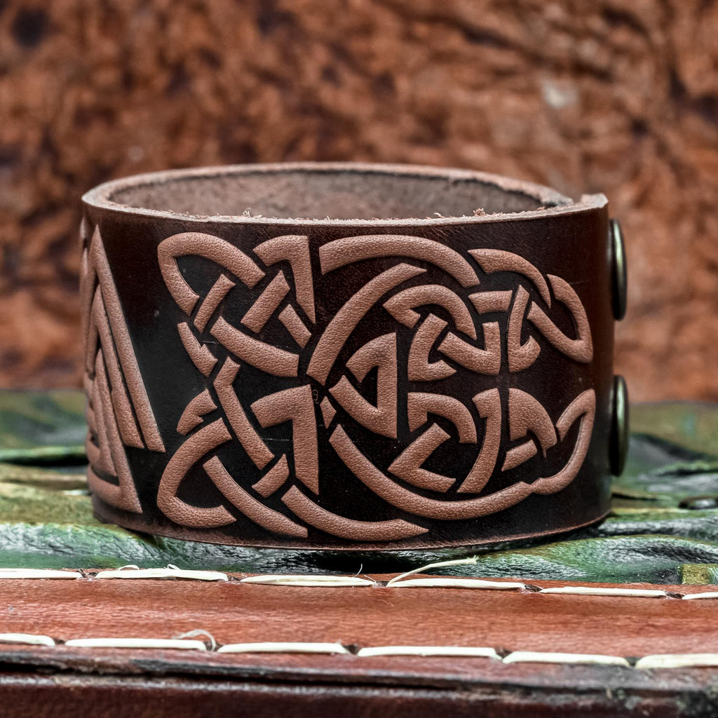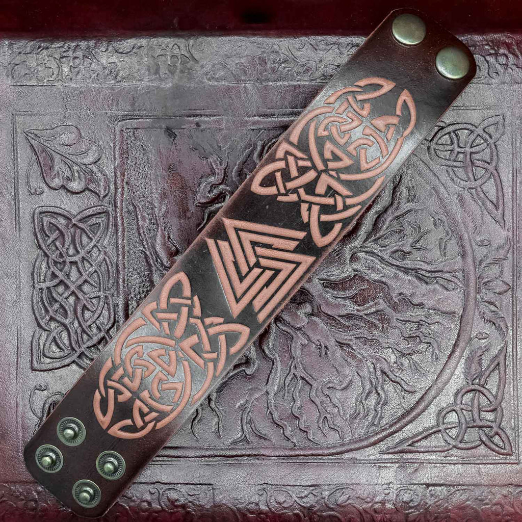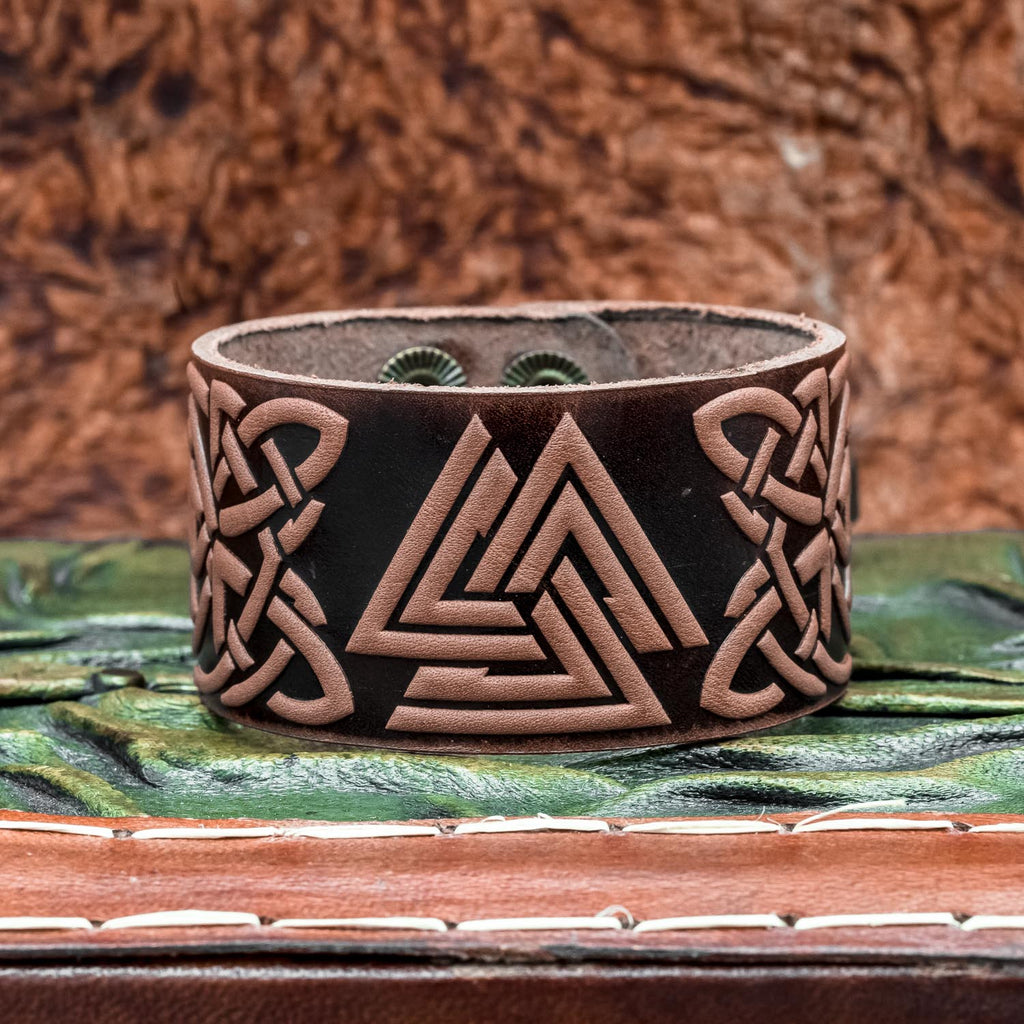This is a masterfully hand crafted cuff in thick dark and light brown died leather featuring the Valknut symbol embossed into it and surrounded by knotwork.
