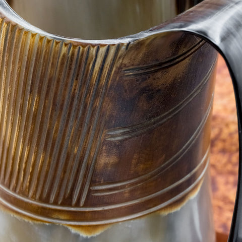 Horns are by-products of the meat industry. Our horns are salvaged from this so instead of going to waste, they are cleaned, reconditioned and turned into a beautiful vessel to start a new life. They're hand crafted of natural materials (ox or cow horn) so are likely to present some marks from the previous life or crafting process. None have a perfectly smooth finish by the very nature of the items which adds to their rustic charm. Each is handmade, beautiful and unique. All our horns are cleaned, sculpted and polished by our craftsman to a beautiful finish and are safe to drink from.