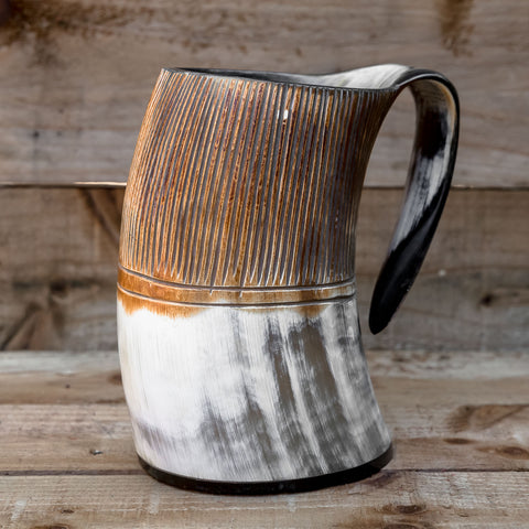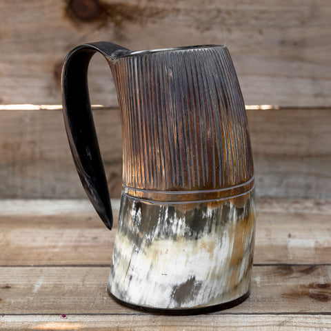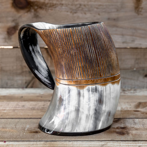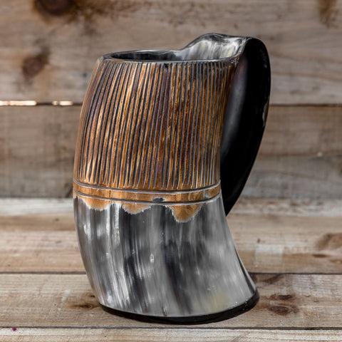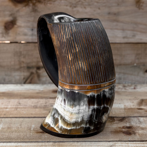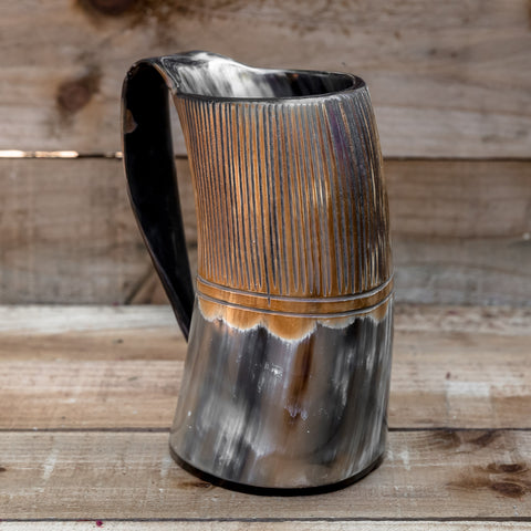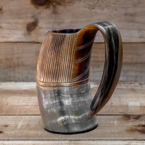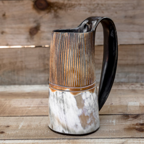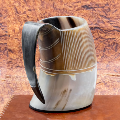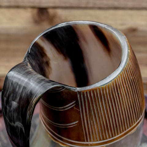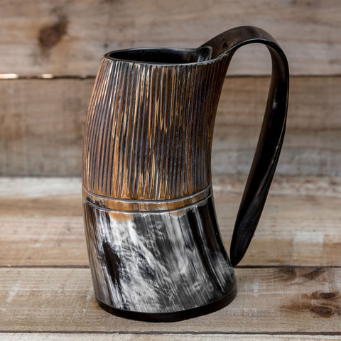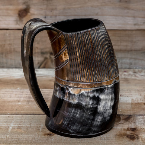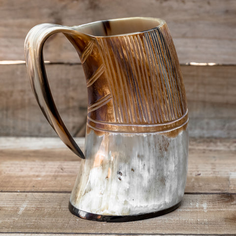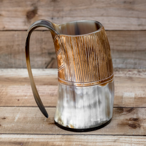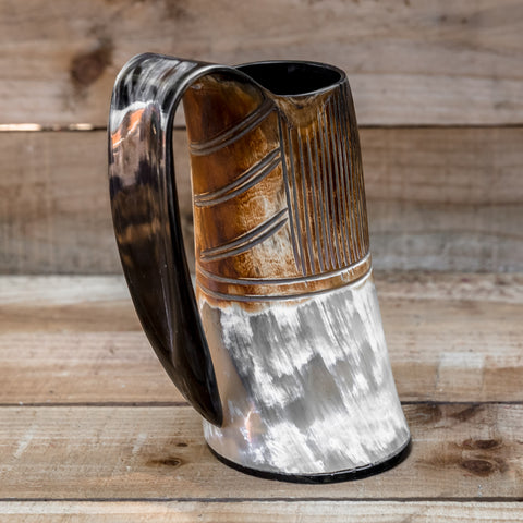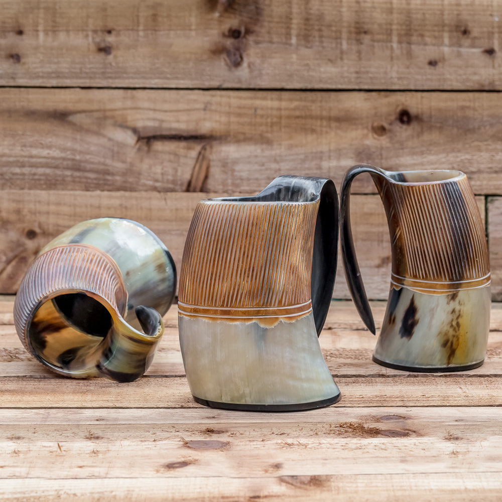 These natural horn tankards have a carved design into rough horn on the top and polished horn on the bottom. The design is hand carved into the tankards. The bottom of the tankard is made out of black resin and it adds to the sturdy build of the tankards.