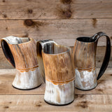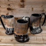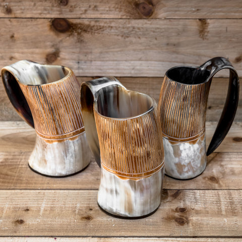 These natural horn tankards have a carved design into rough horn on the top and polished horn on the bottom. The design is hand carved into the tankards. The bottom of the tankard is made out of black resin and it adds to the sturdy build of the tankards.