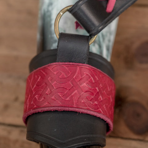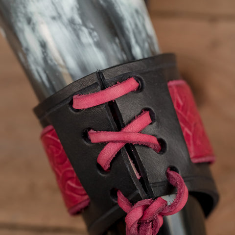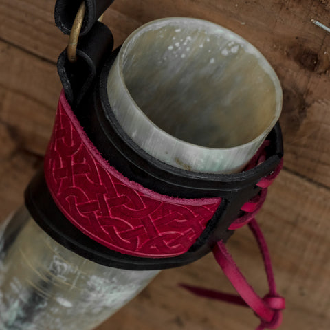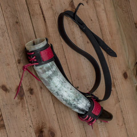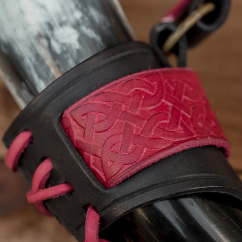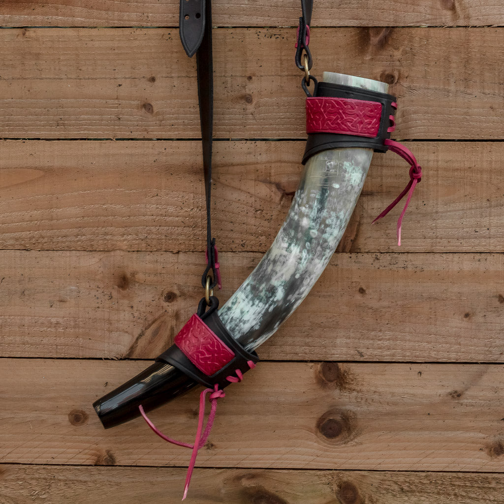 Our new range of blowing horns are bigger, thicker, louder and come with a deluxe hand carved adjustable strap in thick black and red leather with amazing knotwork details on the strap.