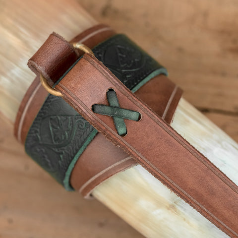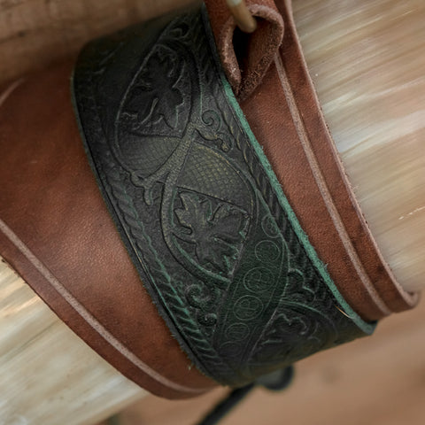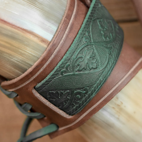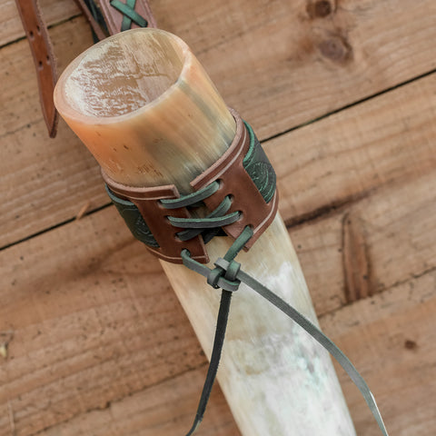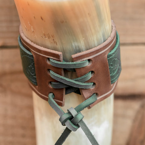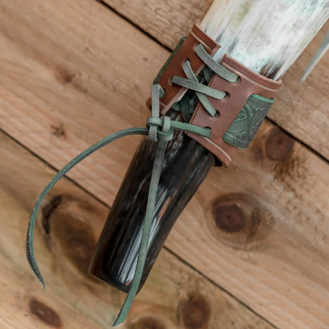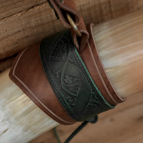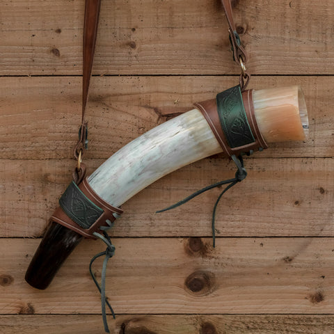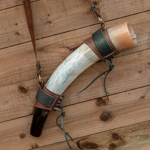 Our new range of blowing horns are bigger, thicker, louder and come with a deluxe hand carved adjustable strap in thick brown and green leather with amazing details on the strap.