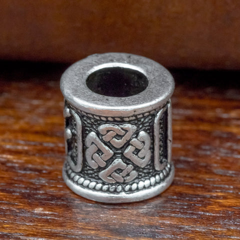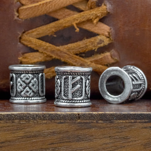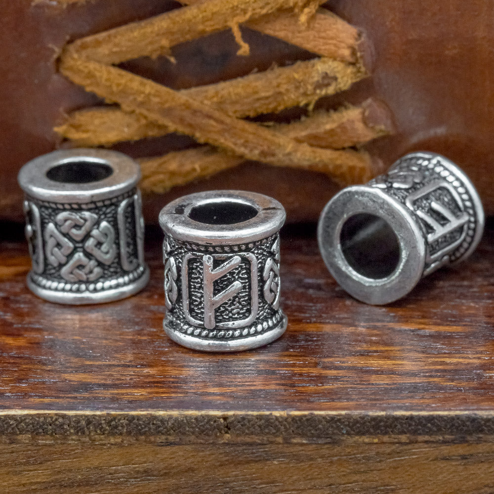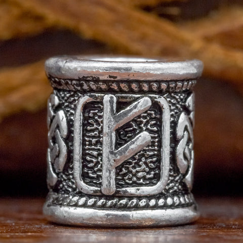 This bead has a Fehu rune on the front and back, and shield knots on the sides.