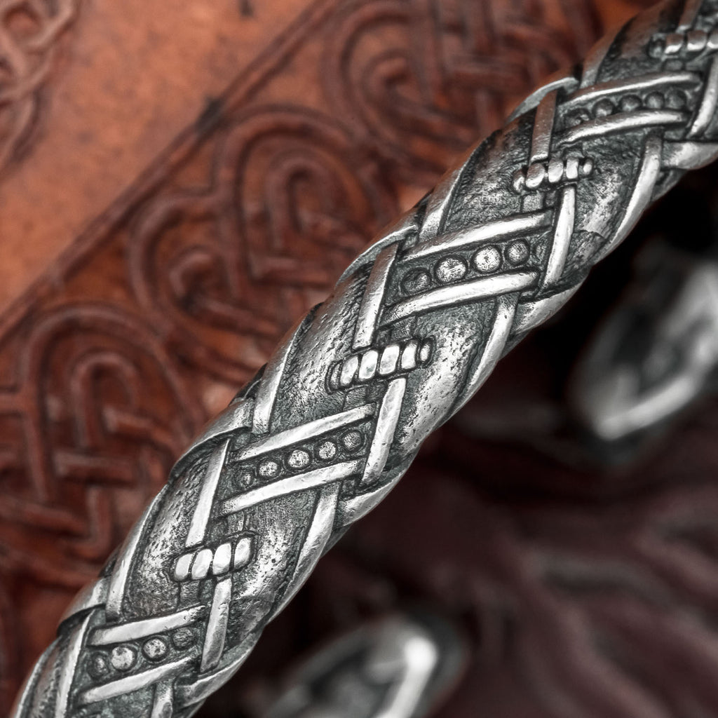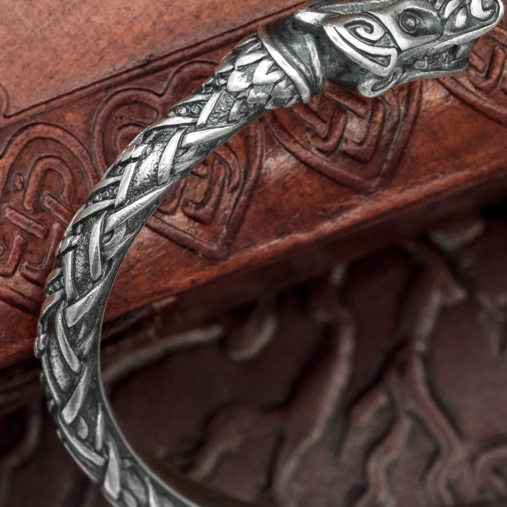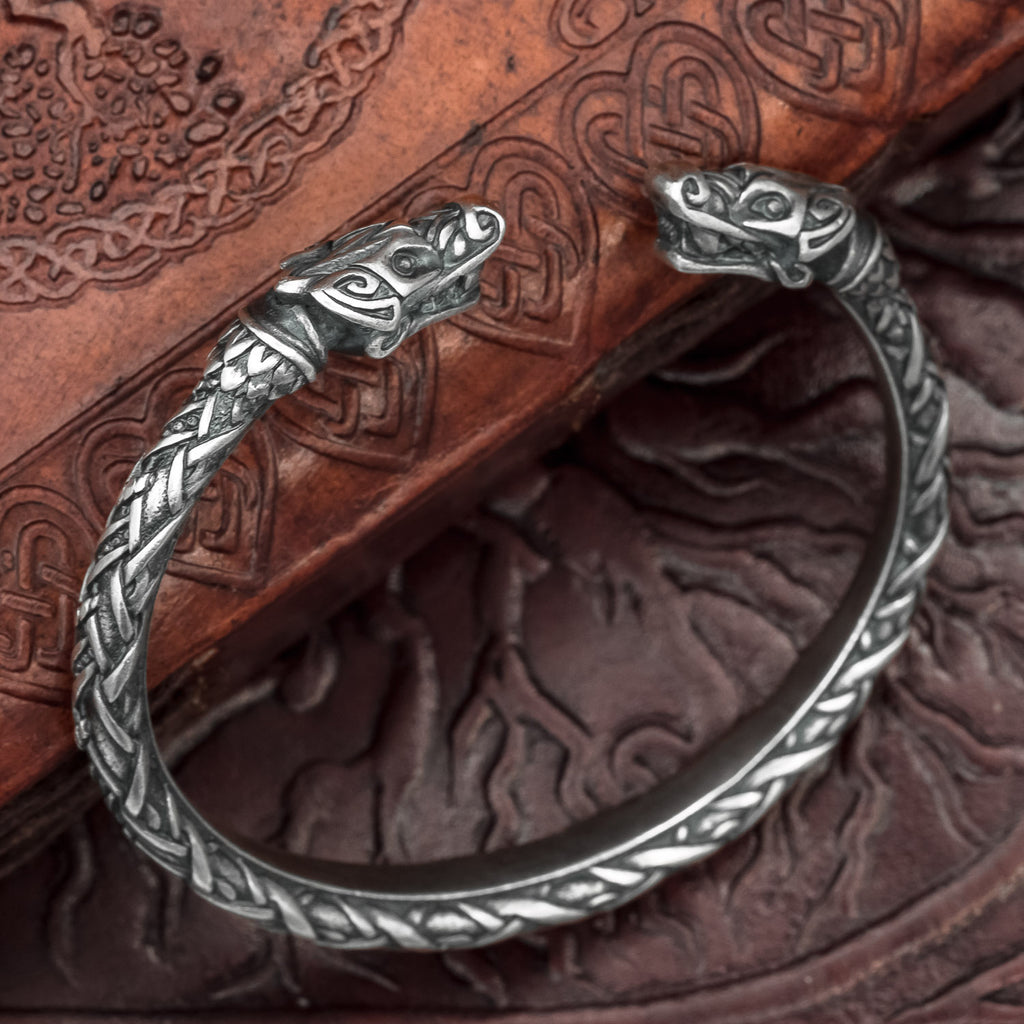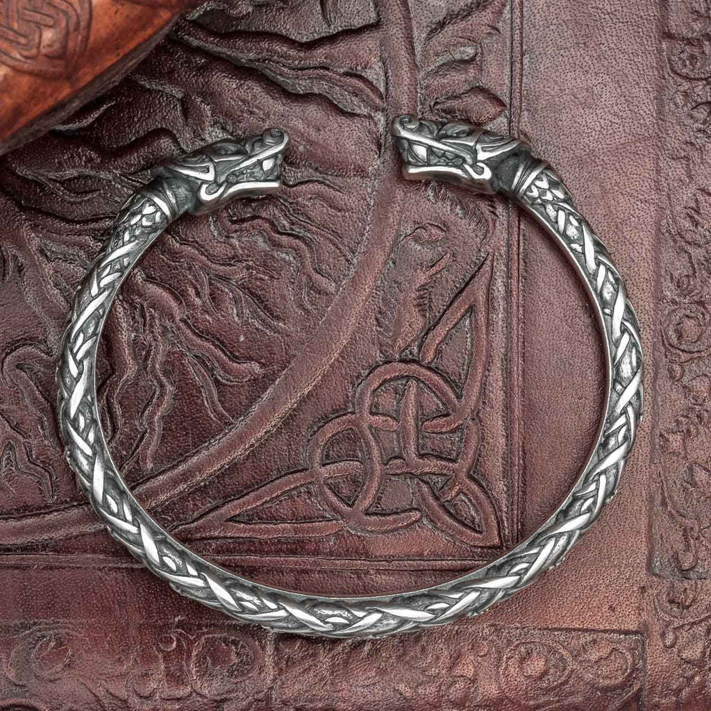 This solid Viking arm ring has wolf heads at each end, connected by a knotwork detailed band. It is hand made from Bronze and silver plated with the finest Italian Silver.
