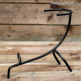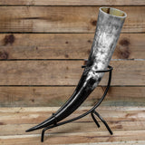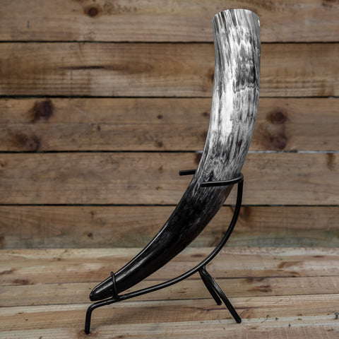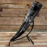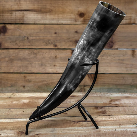 This is a hand forged iron stand suitable for our regular and large drinking horns. It holds horns of 1-2 pints depending on the width and length of the horn. This listing is for the straight stand as seen in the images.