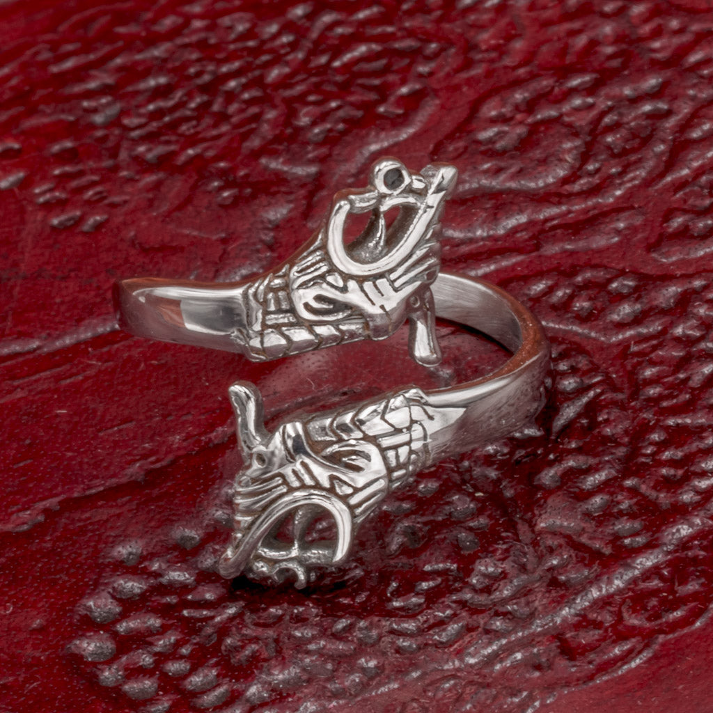 Inspired by the 10th century discovered in the excavations of the Viking settlement of Hedeby, this open ended ring featuring dragons is made from stainless steel.
