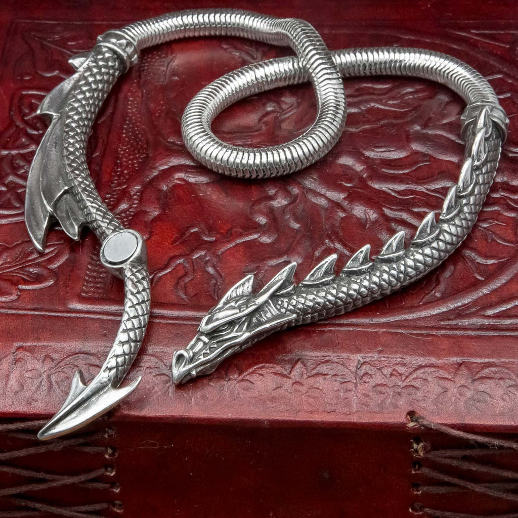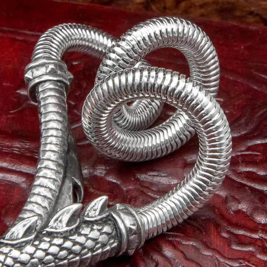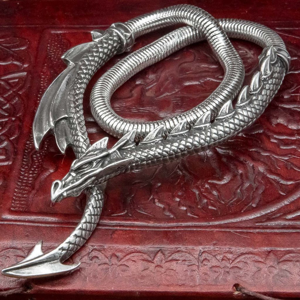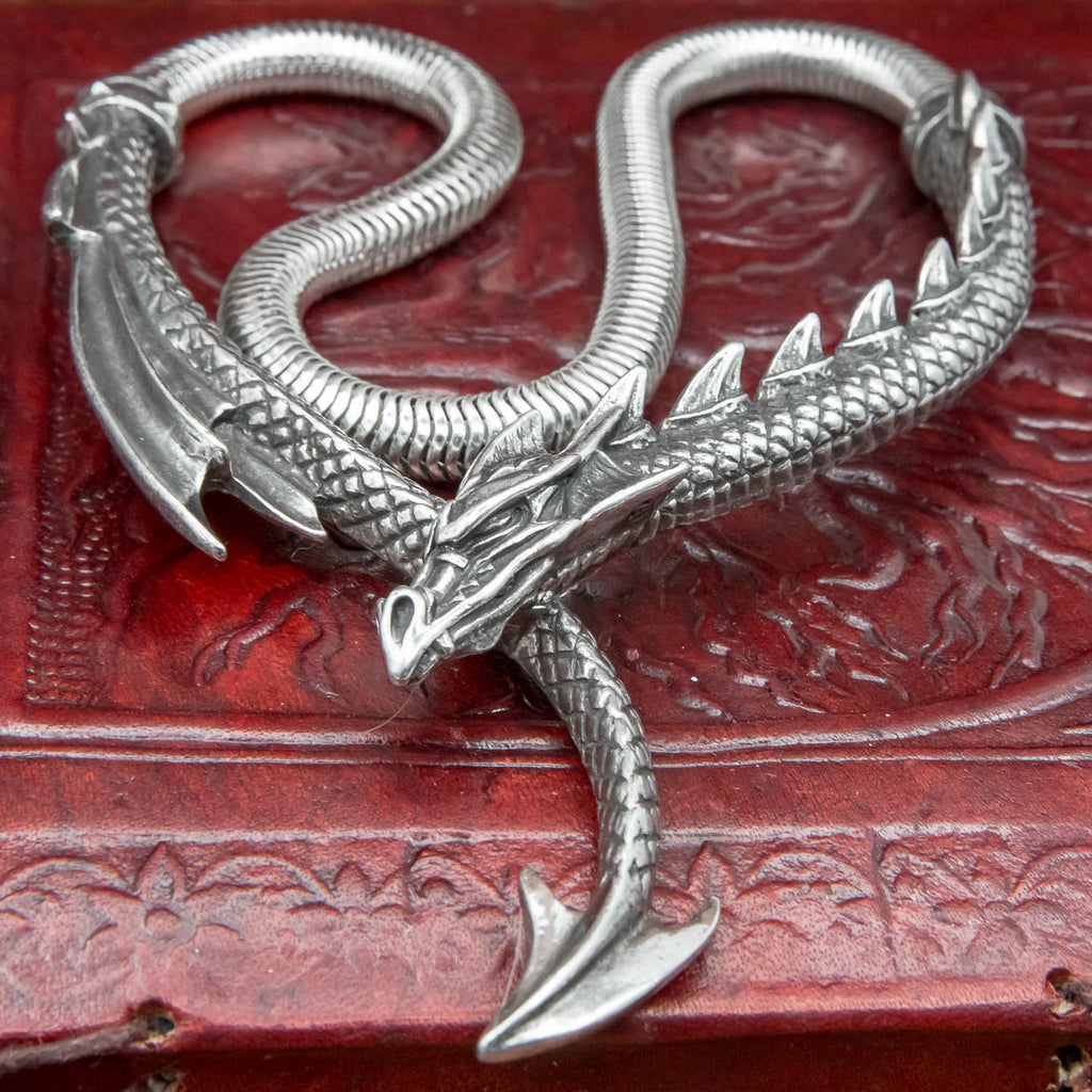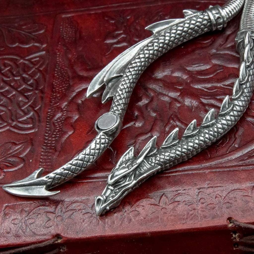 This Jormungand is a large solid pewter necklace with a snake chain in an antiqued and polished finish that wraps around the neck and clasps at the front with a magnetic clasp located under the head.