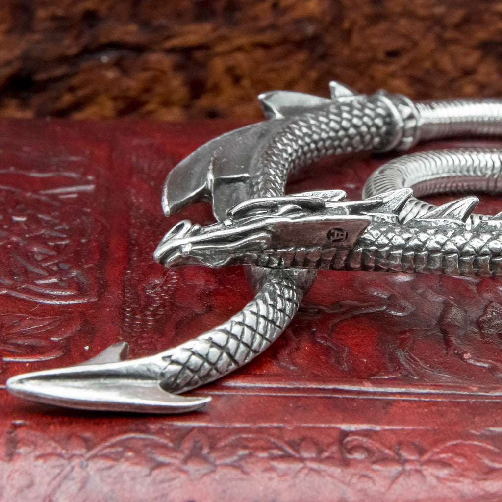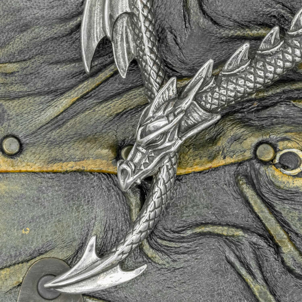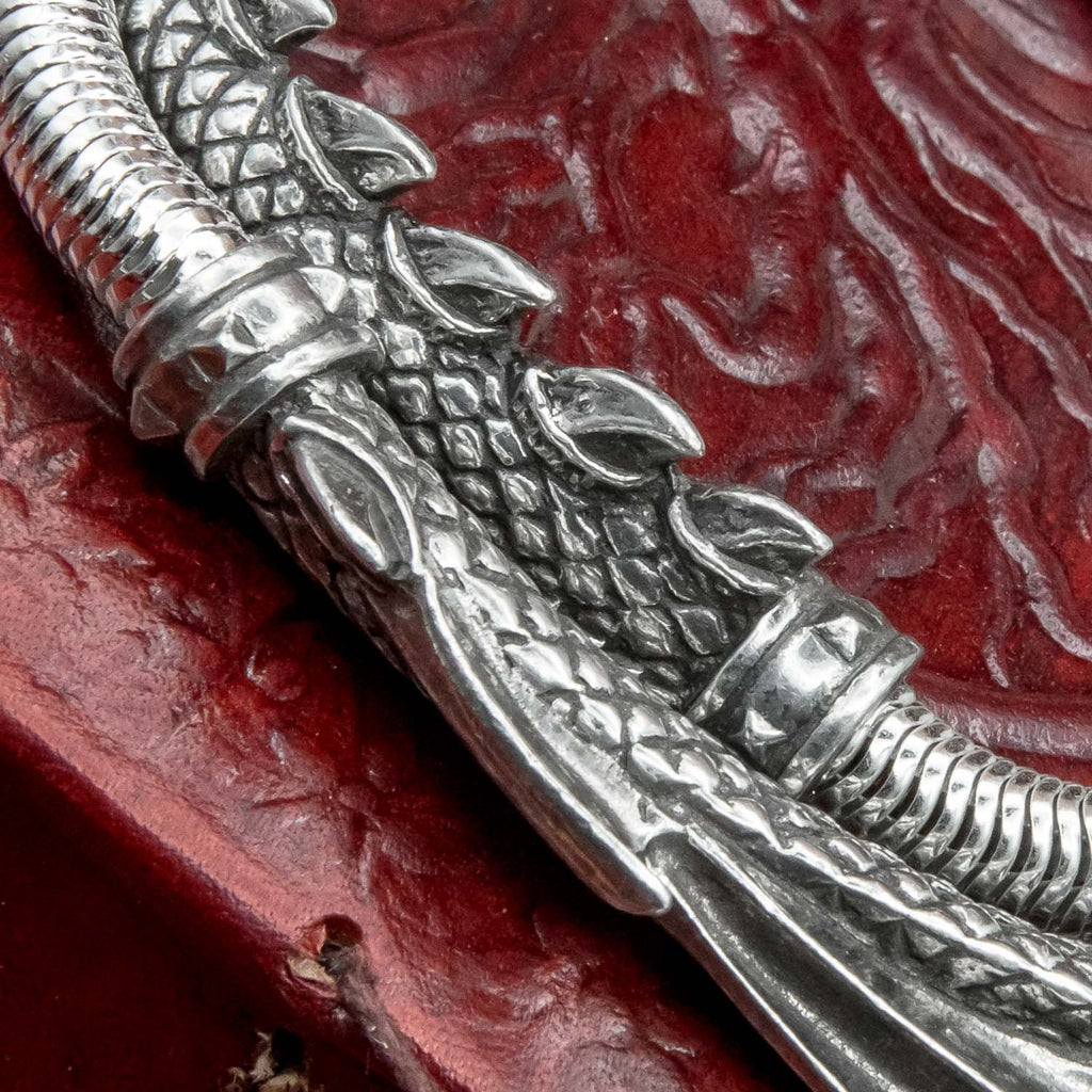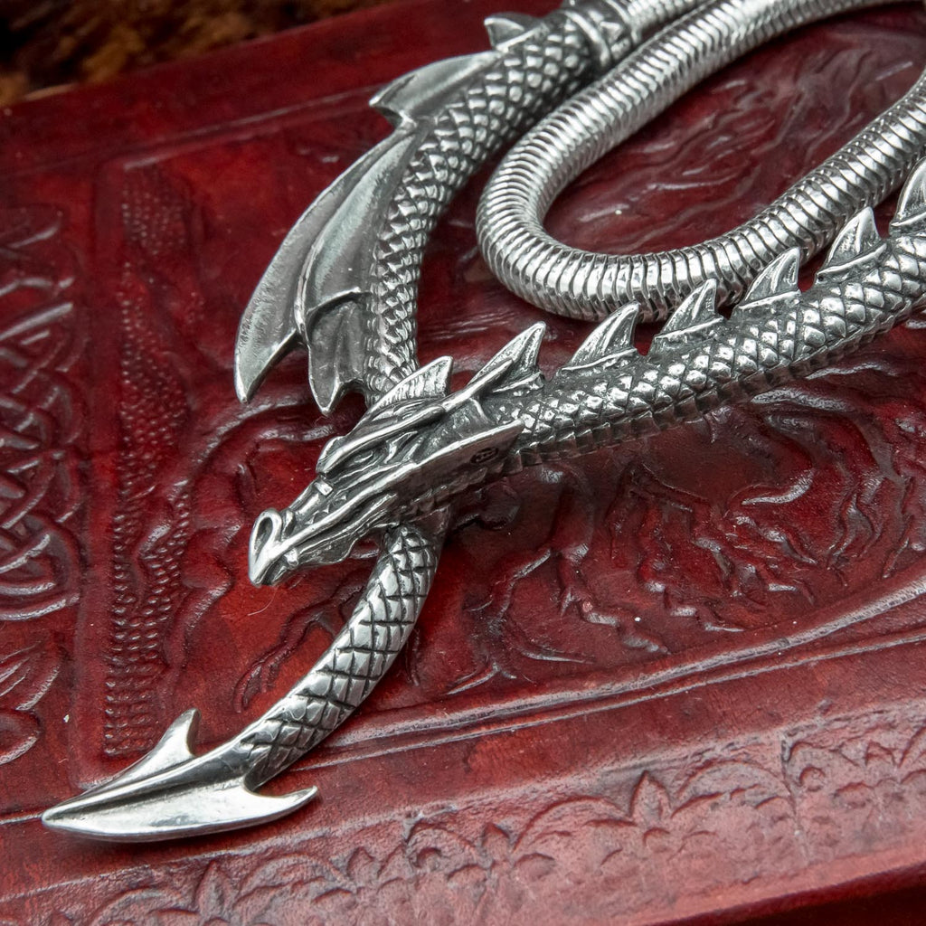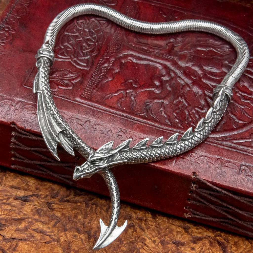 This Jormungand is a large solid pewter necklace with a snake chain in an antiqued and polished finish that wraps around the neck and clasps at the front with a magnetic clasp located under the head.