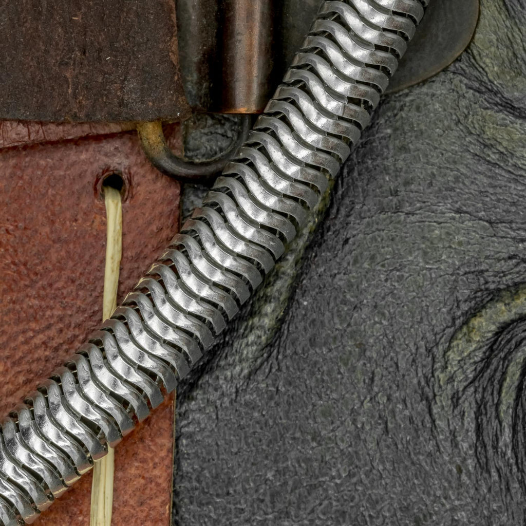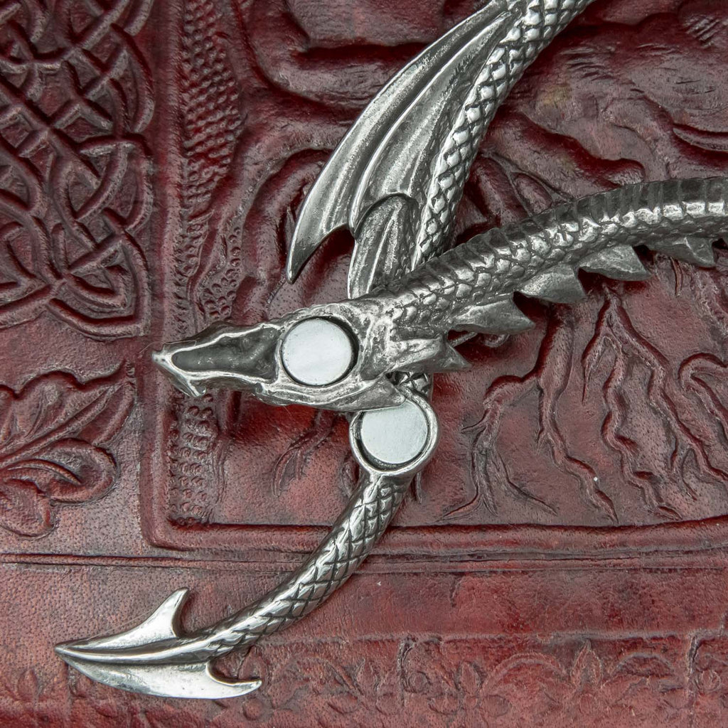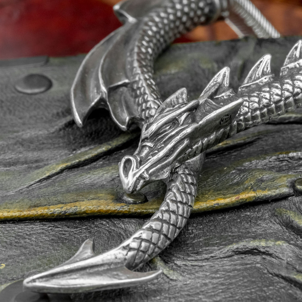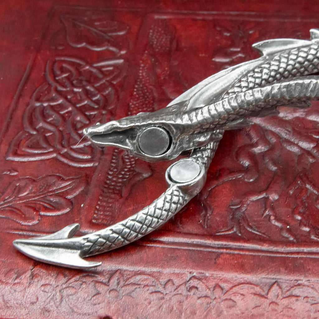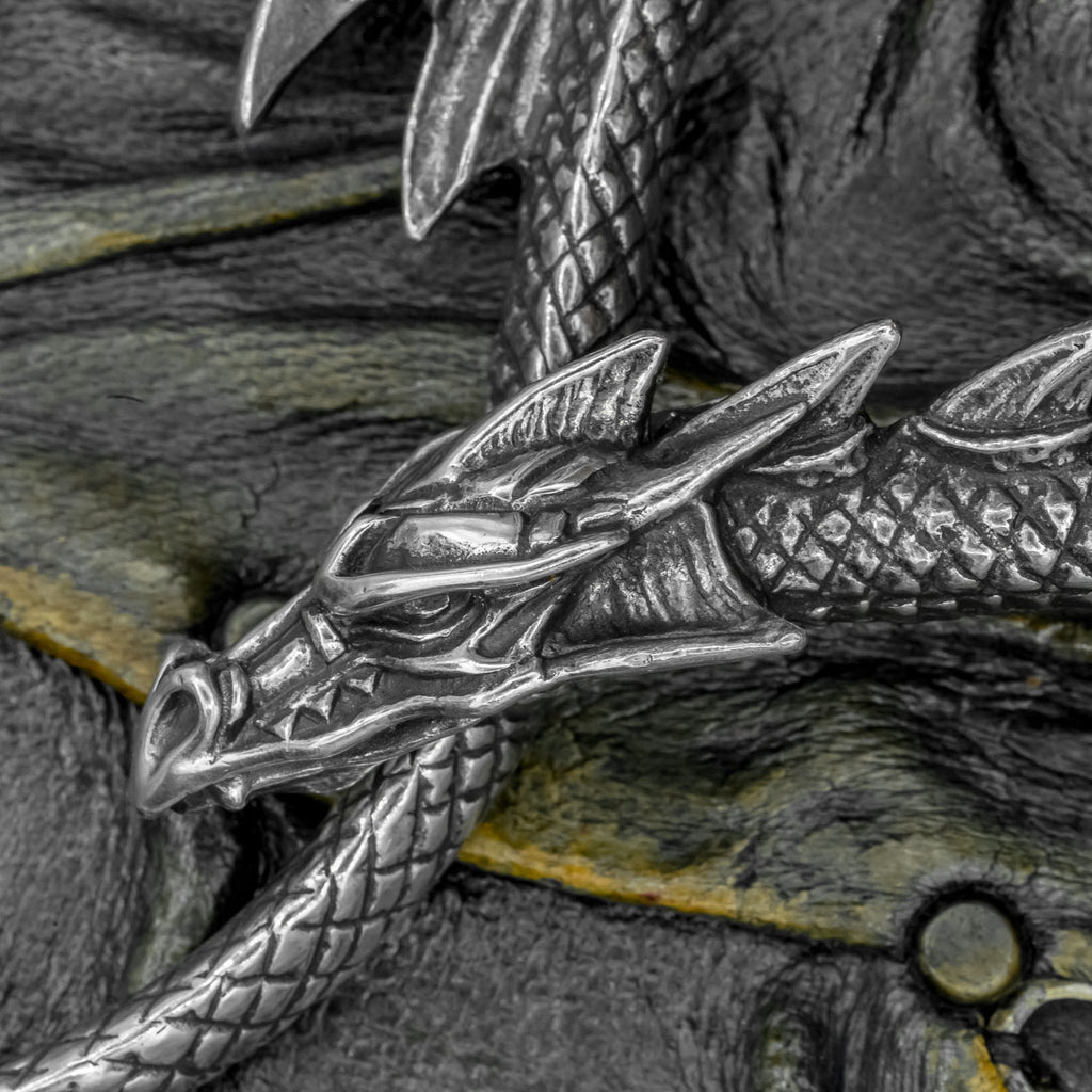 This Jormungand is a large solid pewter necklace with a snake chain in an antiqued and polished finish that wraps around the neck and clasps at the front with a magnetic clasp located under the head.