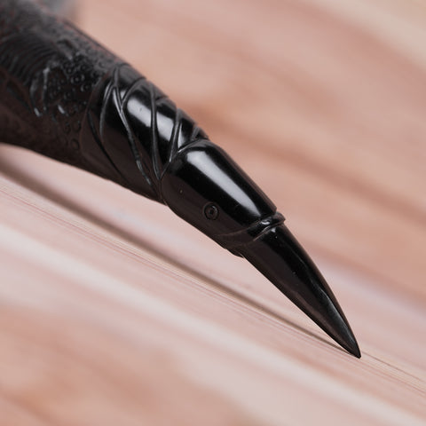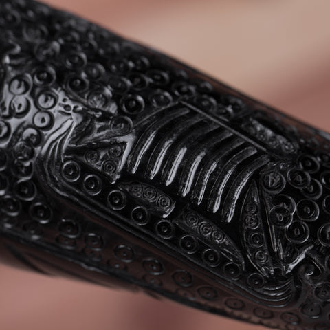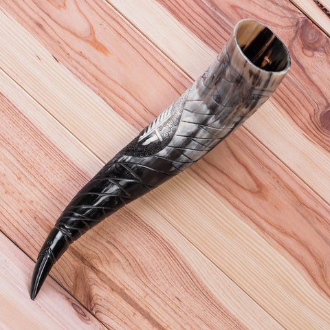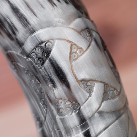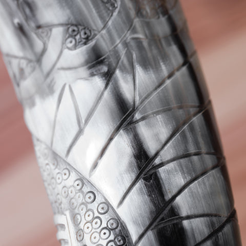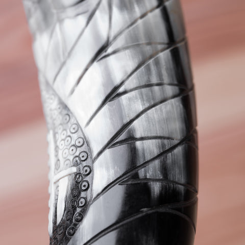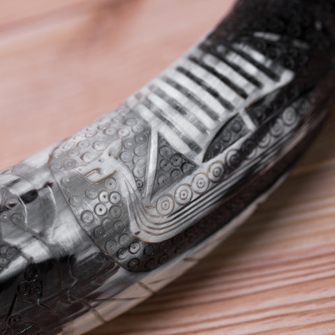 This horn ranges from black to white with highlights in cream and white. It has been hand carved to to represent a fleet of Viking Longships with one large one primarily and a smaller one carved fading into the black representing more following into the distance. The top has an Oseberg knotwork band and the tip has been carved into a raven. The longship has a dragon's head and shields on the side of the ship carved to complete the design. The horn is carved on every side so please pay close attention to the images to fully appreciate the craftsmanship that went into creating it.