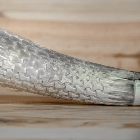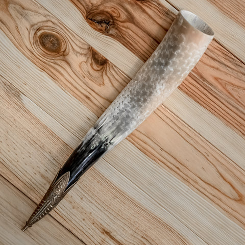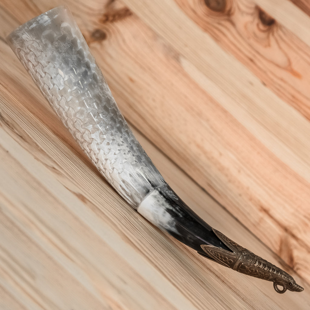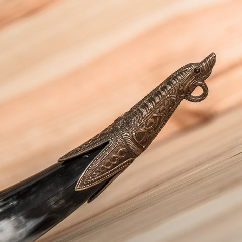 An extraordinary horn painstakingly hand carved in the Oseberg style over many hours and embellished with hand cast tin inspired by archaeological finds. The knotwork is repeated on the horn with great attention to detail and care.