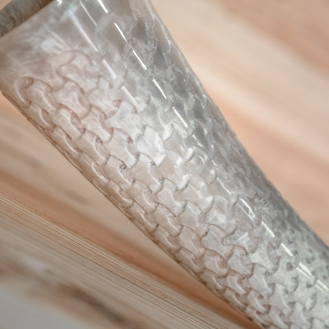 The terminal is a hand cast and traditionally made design based on a chape found in the St Ninian's Island Treasure(Shetlands, Scotland) dating from the 9th century.