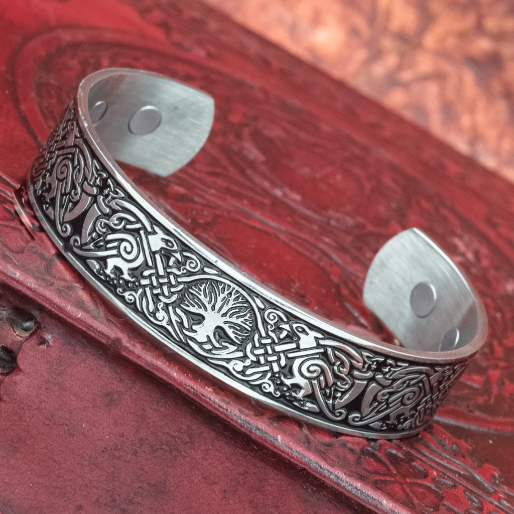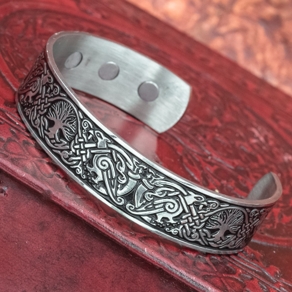 This bangle features Yggdrasil (Tree of Life) surrounded by a repeating design with ravens.