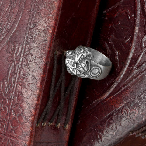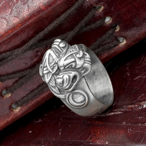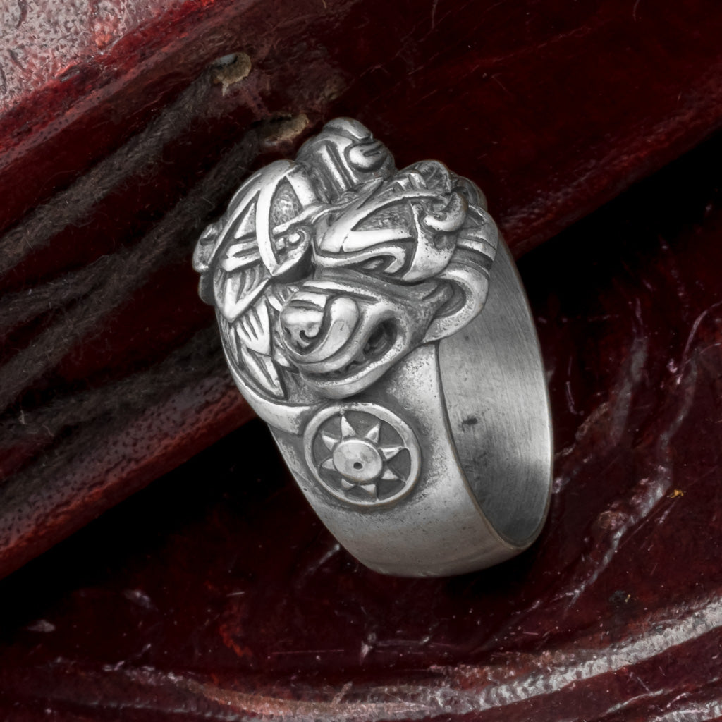 This ring features two wolf heads representing Skoll and Hati wirh representations of the sun and the moon next to each one. It is made from Bronze and plated in fine Italian Silver.