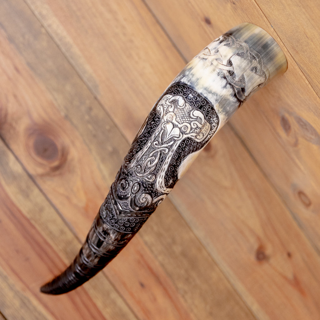 Hand carved to showcase a Skåne inspired Thor's Hammer, this black and white horn features a knotwork band at the top with a partial band of the same knotwork separating the end of the horn which has been carved into a round motif.
