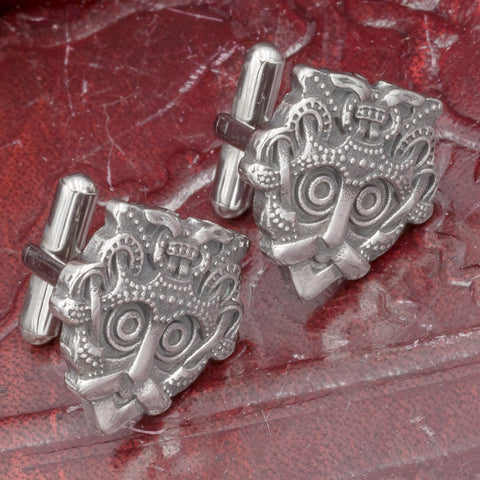 This is set of Gnezdovo Mask cuff links and matching tie clip in the Mammen Style, made from stainless steel based on an original find of the treasure of Gnezdovo discovered in 1868.