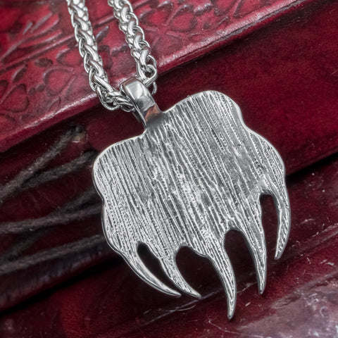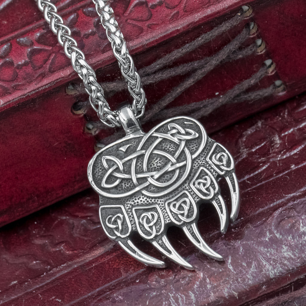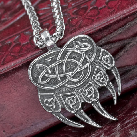 This Veles Paw amulet is made from stainless steel with knotwork and Trinity Knot detailing and hangs on a stainless steel chain.