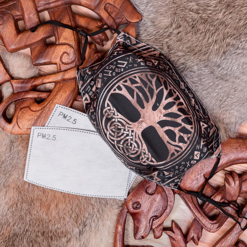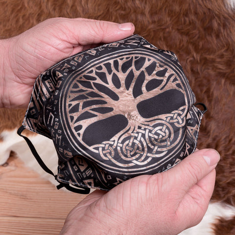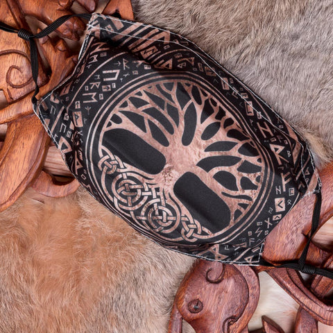 This face mask with adjustable straps with a design of Yggdrasil, the Tree of Life, encircled by runes.