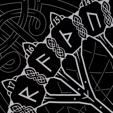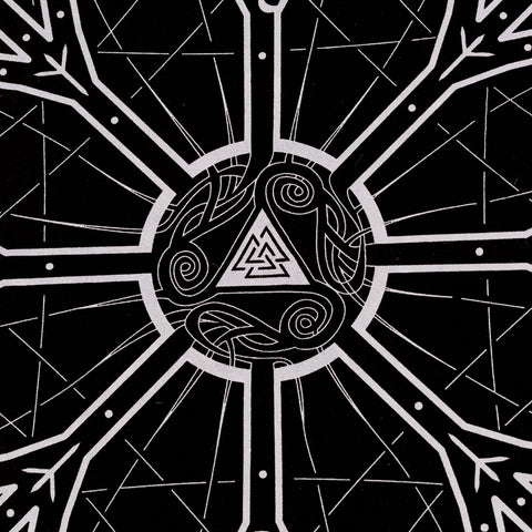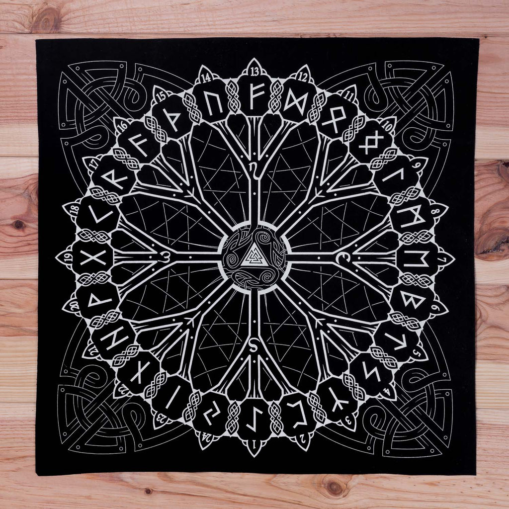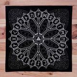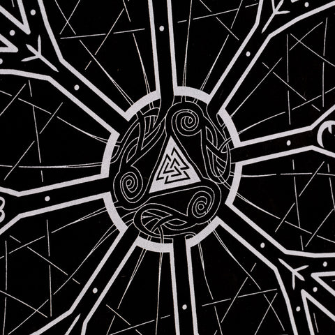Made from black and white velvet, this cloth features the Valknut symbol surrounded by the Futhark runes. It is perfect as a tablecloth or for your altar.
