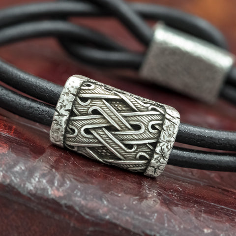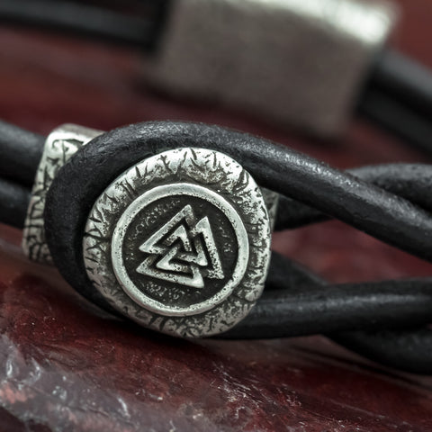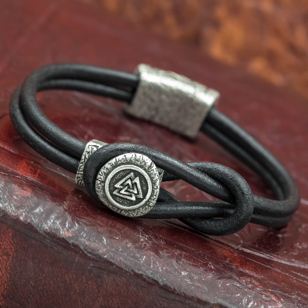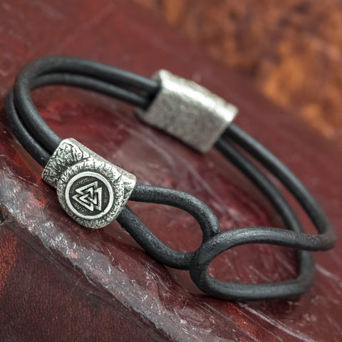 This is a masterfully hand crafted leather hook bracelet in black leather featuring the Valknut symbol embossed into it opposed by a knotwork charm. Both the Valknut and knotwork charm are handmade using the ancient lost wax method from Bronze which is then plated in fine Italian silver.