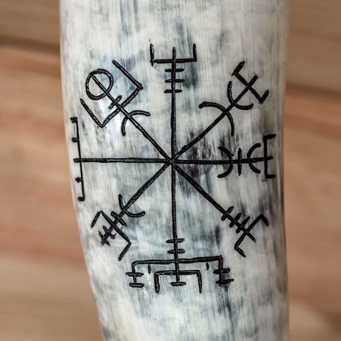The Vegvisir is hand carved into the horn. The Vegvisir may or may not be blackened with ink depending on the lower layer of the horn. If you have a preference for a horn with or without a painted inside of the carving, just let me know. If you do not specify, it will remain at the artistic discretion of our horn carving shieldmaiden.