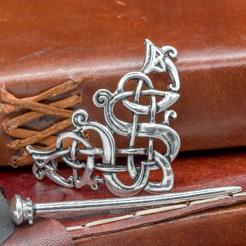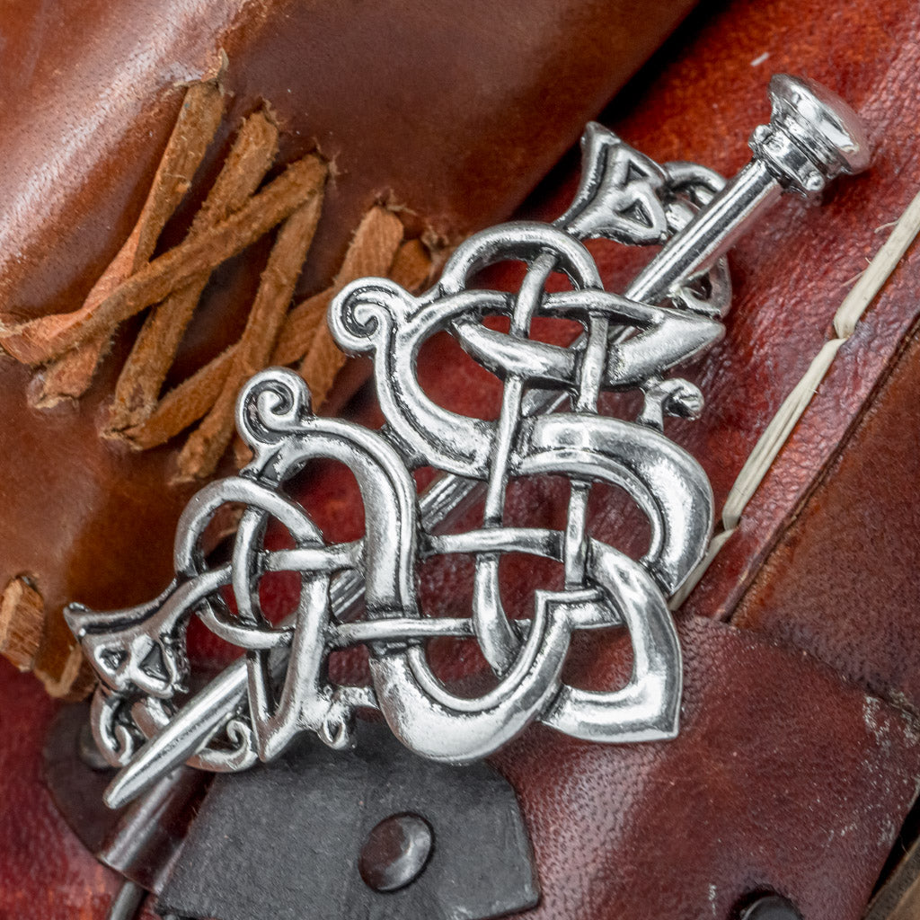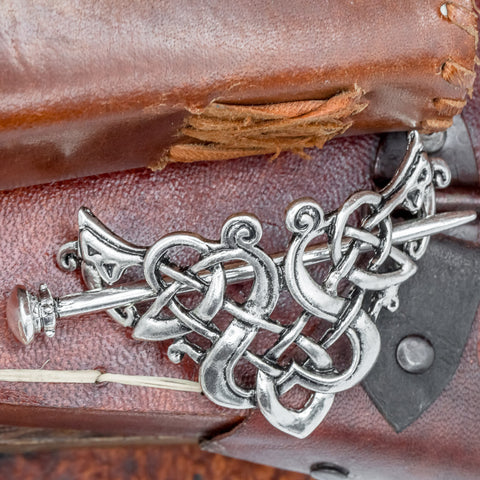 A beautiful example of how knotwork can create a stunning hair piece to complete your Viking look, this hair clip fastens onto your hair securely by sliding the hair pin through the specially placed gaps in the knotwork. This clip is hand made out of zinc alloy with an antique finish.
