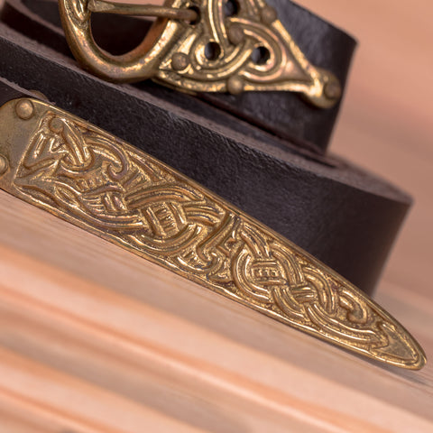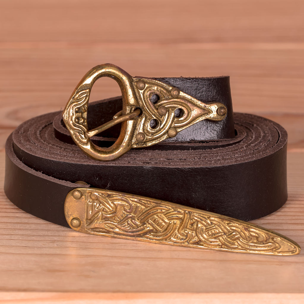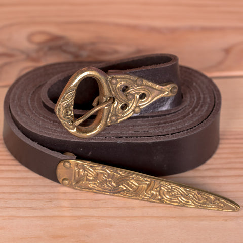 This extra long brown leather belt features an authentic brass buckle and belt end fitting. The design is based on archaeological finds made in Europe and England and the finish of the brass has been distressed to give the belt an aged look. The belts of the 12th century were so long that is was possible to wrap them around the body twice!