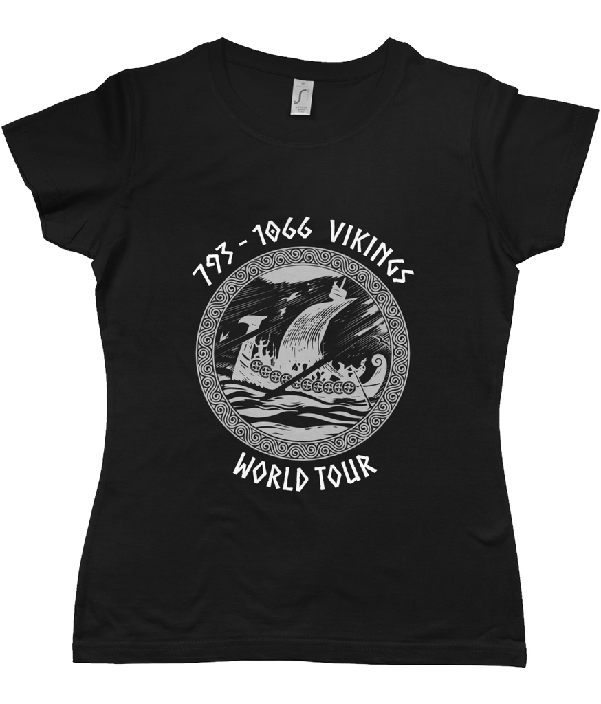 The Vikings were truly the lords of the sea. They traveled all over the world, fearlessly daring the seas and oceans. Celebrating an amazing history, this Ladies Vikings World Tour T-shirt features a Viking Longship design.